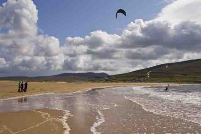 Der Zweite Spot war Lahinch. Lahinch ist eine Surferstadt und der vordere Bereich ist für die Wellenreiter reserviert. Nach fünf Minuten Fussweg teilt man sich aber einen Traumspot mit fünf anderen Kites.